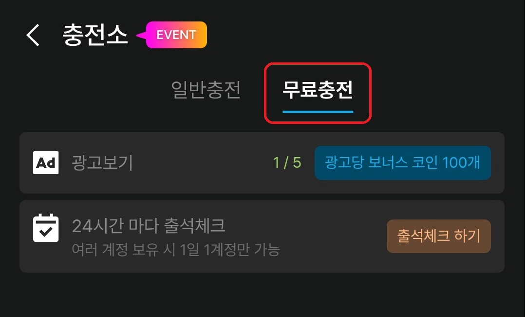 &#x20;  무료 충전은 출석체크나 광고보기 등으로 **별도의 결제 없이 코인을 획득**할 수 있는 충전 방식 입니다.