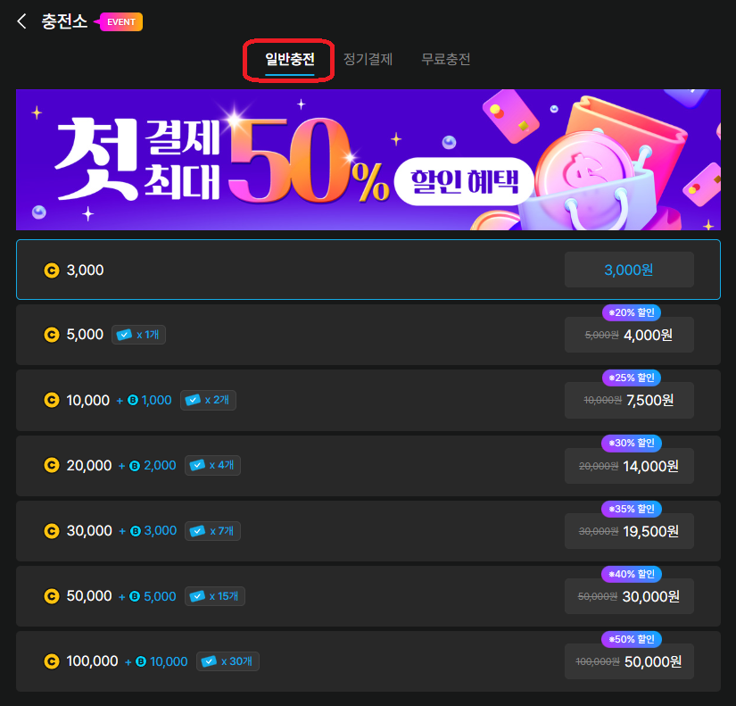 &#x20; 일반 충전은 정해진 액수로 결재 하신 후 코인과 보너스 코인을 충전하는 방식으로 결제 금액이 클수록 할인율도 높아집니다.