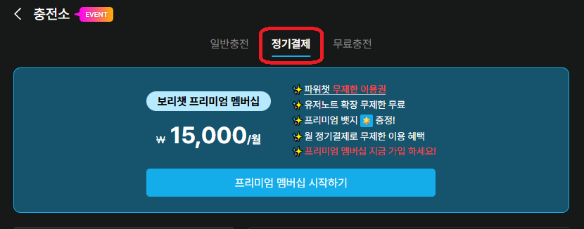 &#x20;  정기 결제는 **매월 자동 결제**를 통해 **정해진 기간** 동안 **파워챗**을 별도의 **코인 소진 없이** **무제한**으로 이용하실 수 있는 결제 방식으로 **웹을 통해서만 결제**가 가능하며 앱에서는 결제가 불가합니다. (웹 정기 결제 시 **사용은** **웹과 앱 둘 다 가능**)