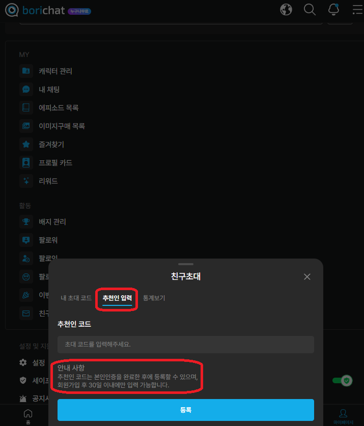 **30일 이내**에만 \[마이페이지] → \[친구 초대] 메뉴를 통해 입력 가능합니다.